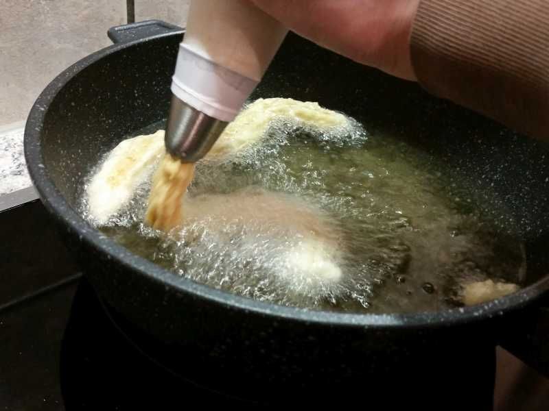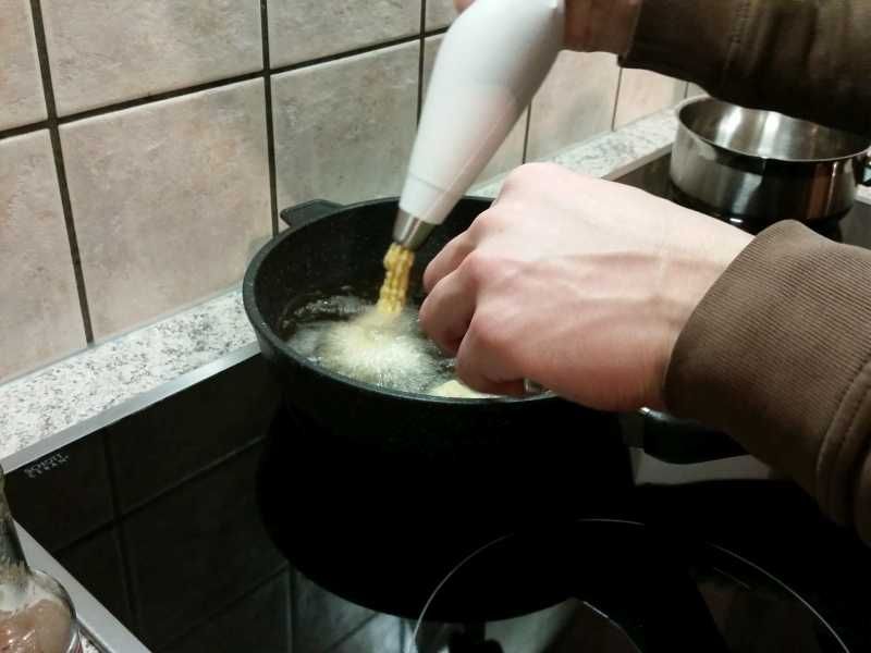 Squeeze the dough in portions directly from the piping bag into the hot oil and fry for 8 – 10 min until golden brown. Turn once after half of the time. Leave to drain on kitchen paper and enjoy warm.