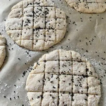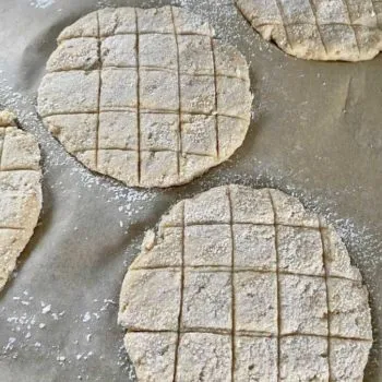 Using a dough card, carefully press a grid into the flat cakes.