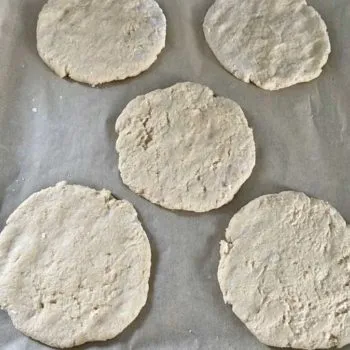 Form the pieces into balls, place them on a baking tray lined with baking paper and carefully press them apart with your fingers to form a flat cake.