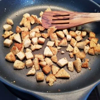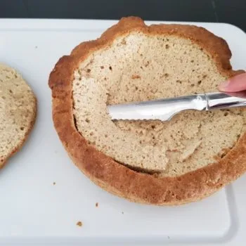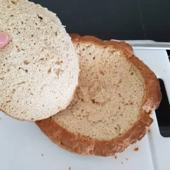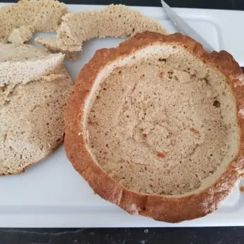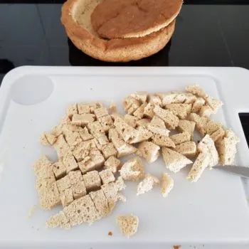 - Allow the bread to cool for about 30 min. Make a 2 cm deep cut with a knife all around the bread loaf, about 1 cm from the edge, then carefully hollow out bottom, leaving a 1 cm lid, cut off the edges and remains. Cut removed bread into small cubes and put aside – if you like you can also make crispy fried croutons out of the cubes adding butter, garlic and salt and use them to make a tasty salad as a side dish.