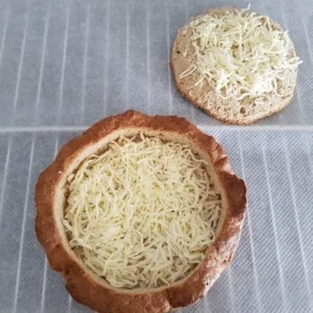 - Spread 2 tablespoons of grated cheddar cheese on the bottom of the bread bowl, scatter 1 tablespoon of cheddar cheese on the inner side of the bread lid and gratinate both pieces at 175 °C for about 10 min.
