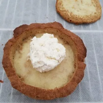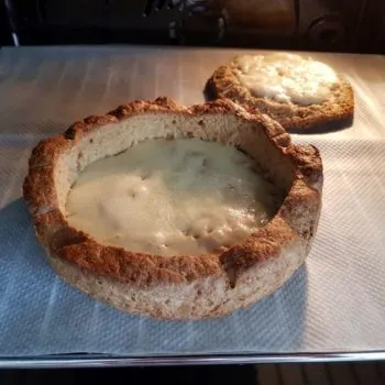 - Put the bread lid on and bake at 175 °C for about 10 minutes, serve hot. One bread bowl can easily serve 4 persons and can be quickly cut into 4 pieces. Optionally: serve with a tasty green salad and freshly made croutons.