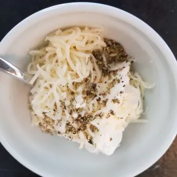 - Mix cream cheese with the remaining cheddar cheese (reserve 1 tablespoon) to a paste. Shape the paste to a ball using 2 tablespoons and place it in the middle of the bread bowl.