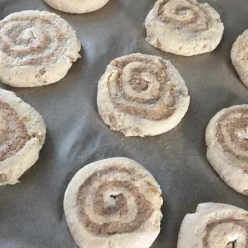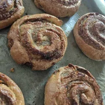 - Spread the filling evenly over dough – roll up the dough plus filling and cut the log into thick slices with a knife – put them on a baking sheet lined with baking paper – gently push the slices apart and flatten out slightly – this way the spirals turn out nice and compact. See pictures in the gallery below!