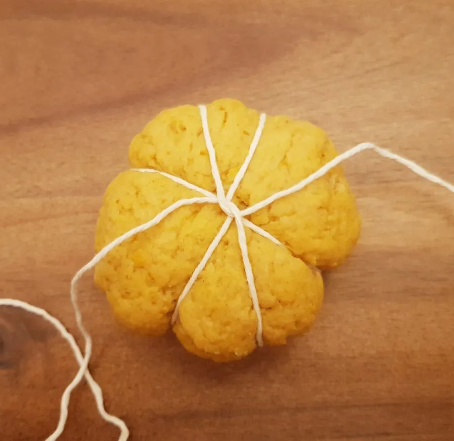 - 1 Put on the yarn cord and place the ball on top of it and loosely wrap the yarn around the ball as in the picture description. So that the pattern of a pumpkin can be created during baking. The yarn really only loose, otherwise it will be difficult to remove it after baking. Press in the middle of the dough ball with your index finger to form a small hollow.