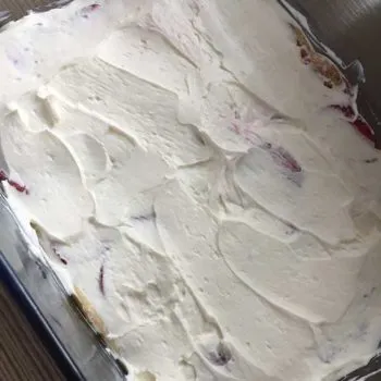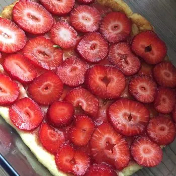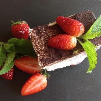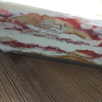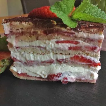 - Now let’s get started on layering the lasagna. You’ll need a lasagna dish or a glass baking dish sized approx. 25 x 20 cm. Start the first layer with pancakes. Lightly spread the strawberry purée over the pancakes, then place the chopped strawberries on top and add a layer of cream. Add another layer of pancakes, strawberry purée and so on. Finish with a covering of pancakes and spread some cream on top. I made 5 layers and used one single pancake to fill the edges of the dish. (see pictures below). Sprinkle cocoa powder all over the top as you like or garnish with a layer of strawberries!