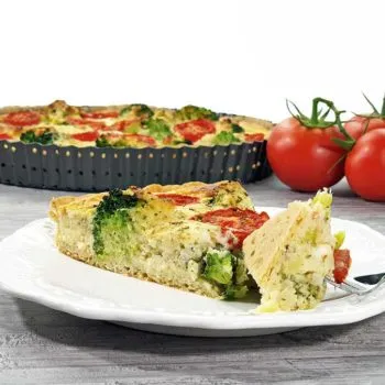 Quiche with a rich almond dough, topped with broccoli and tomatoes. Just 6g net carbs and 226 kcal per piece.